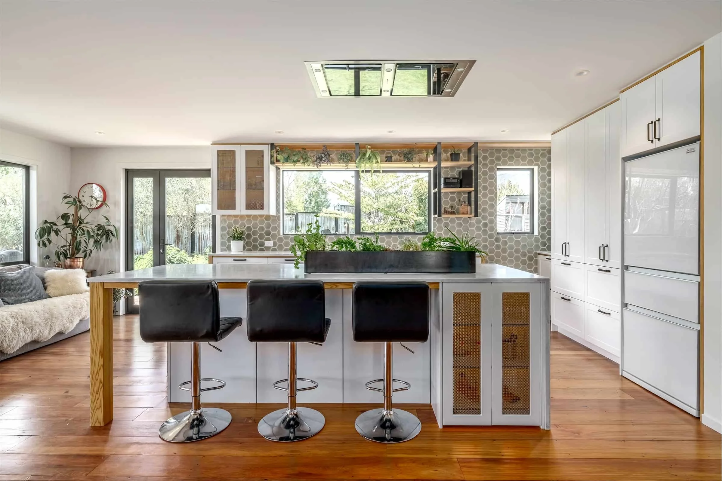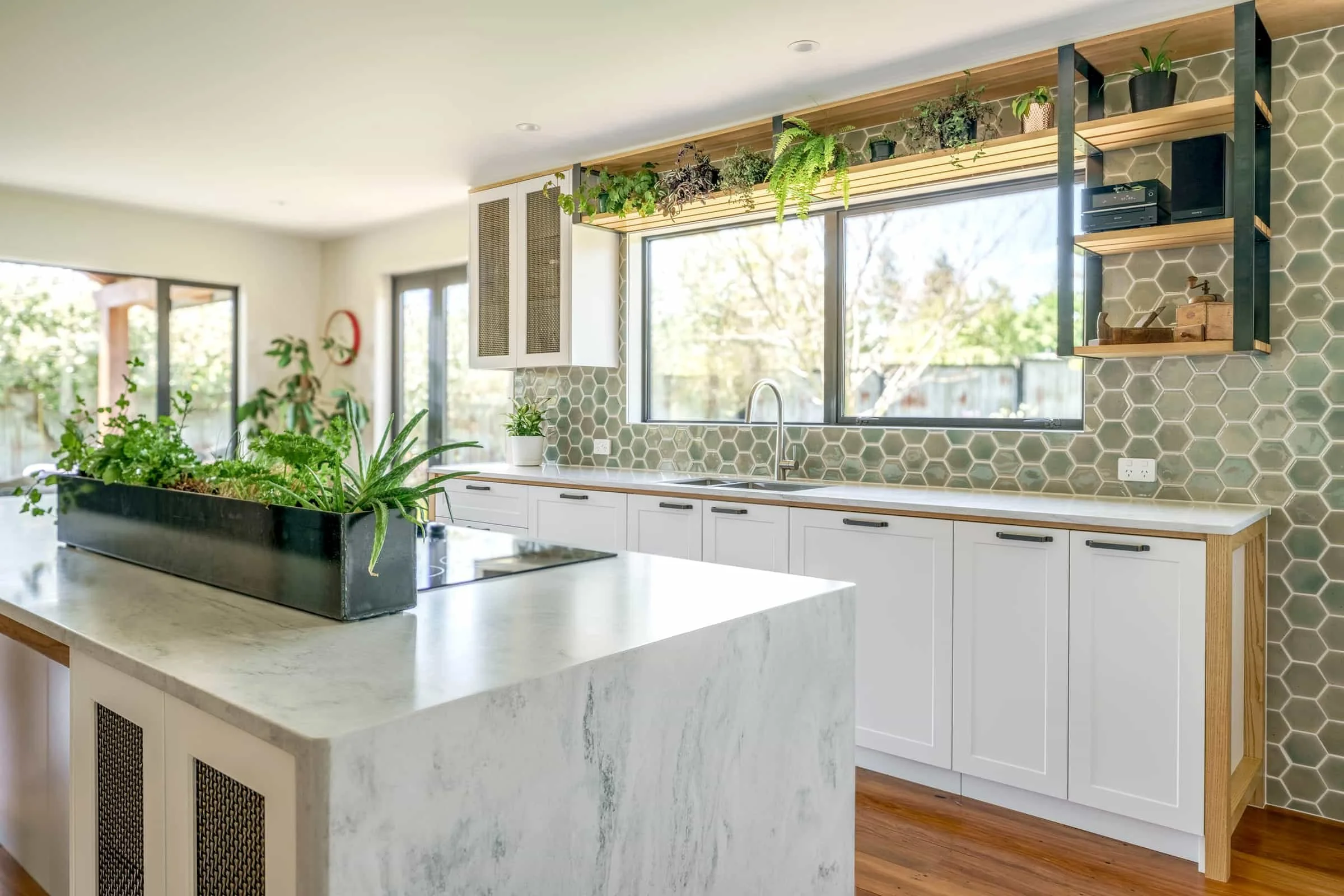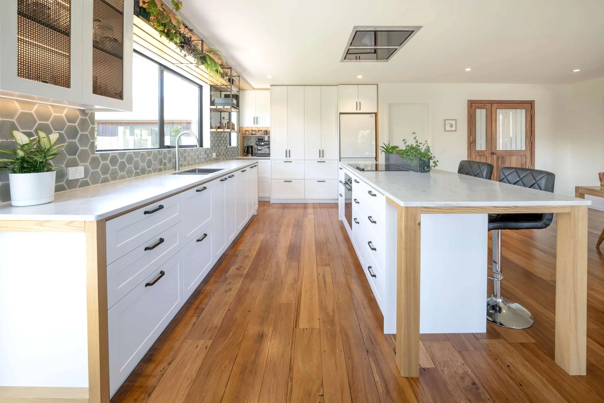 A renovated kitchen blending modern and traditional details, featuring a custom coffee nook.