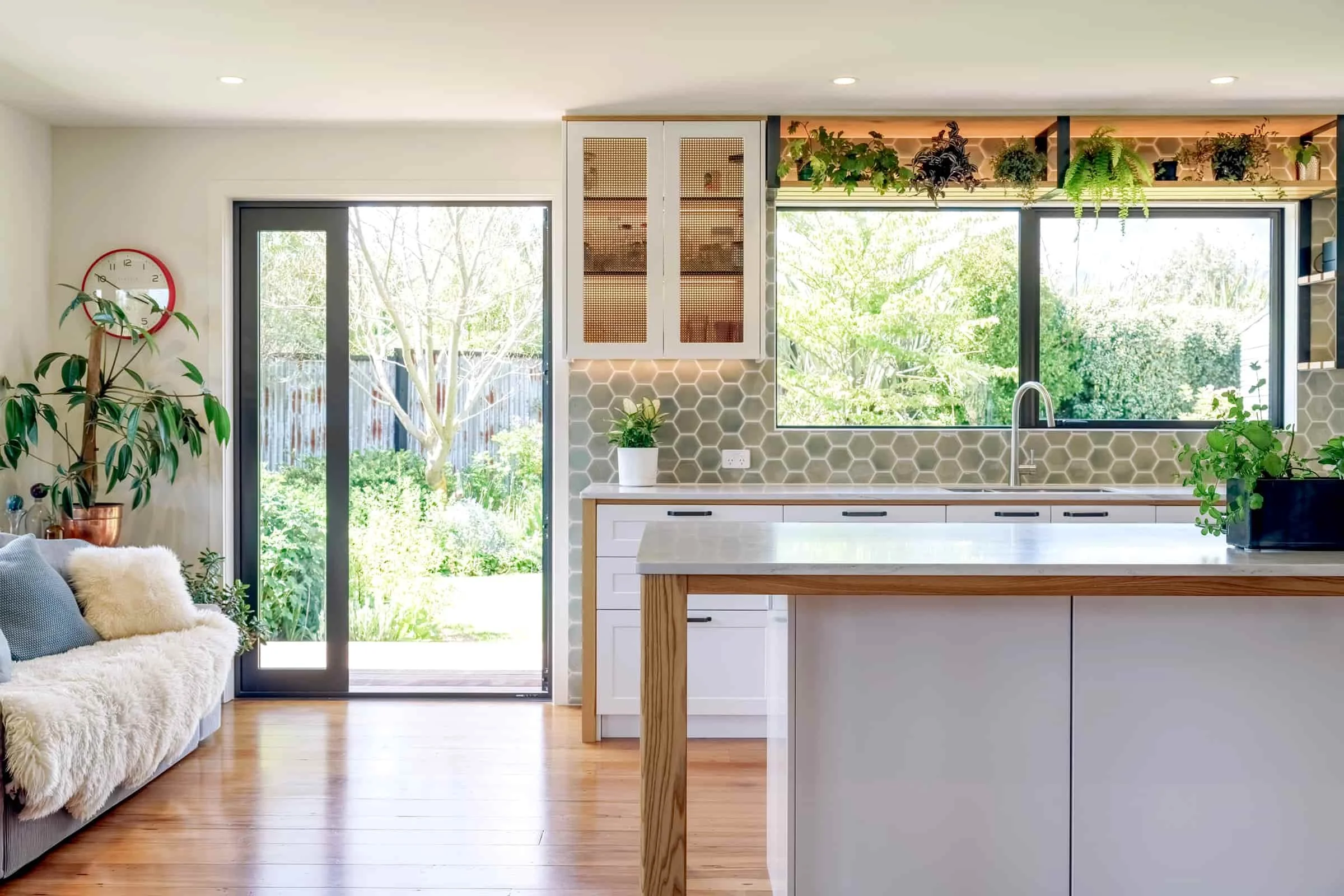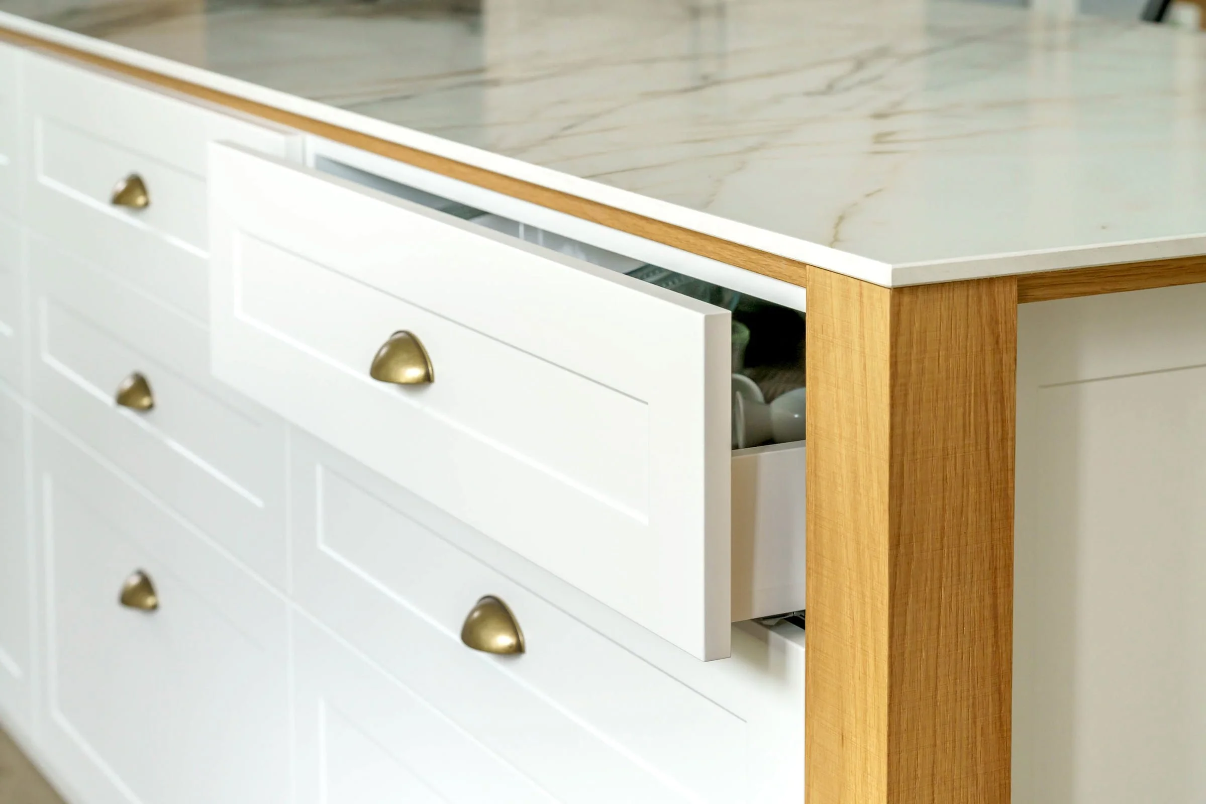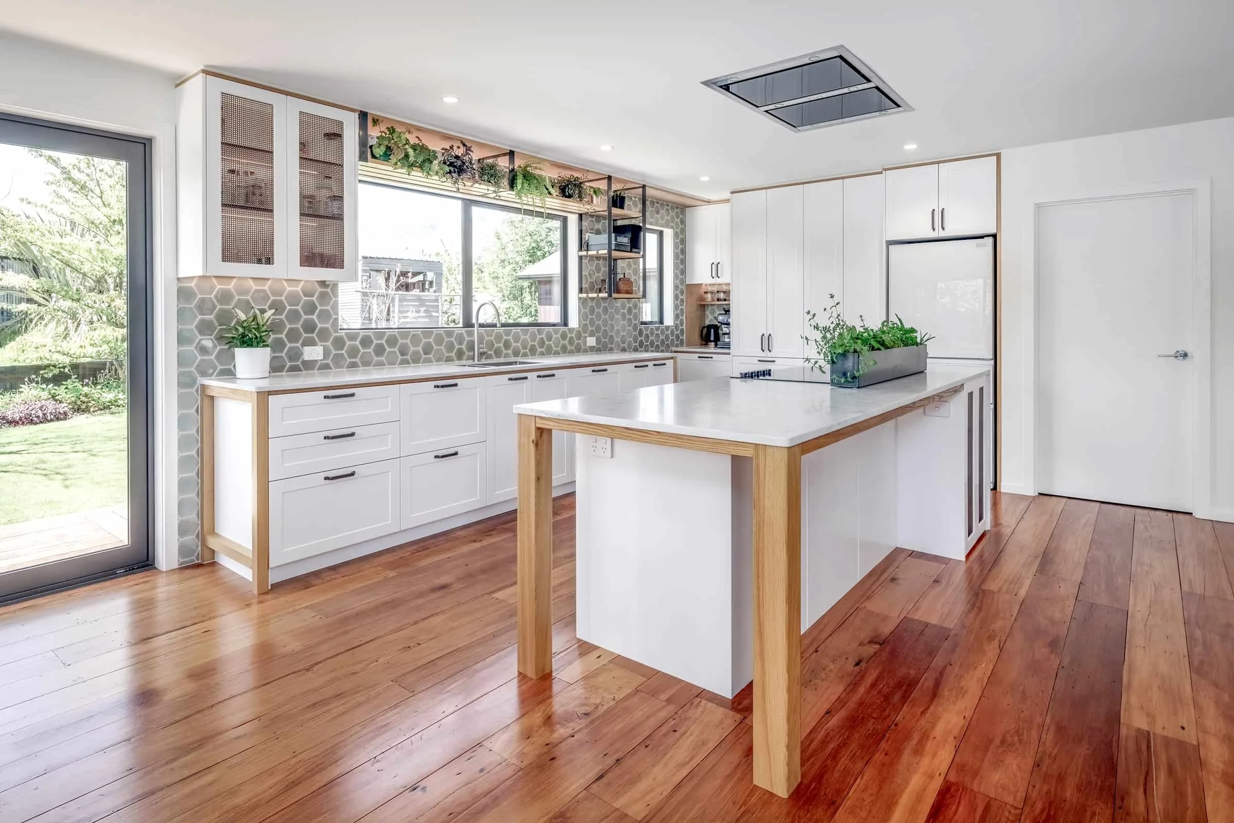 A renovated kitchen blending modern and traditional details, featuring a custom coffee nook.